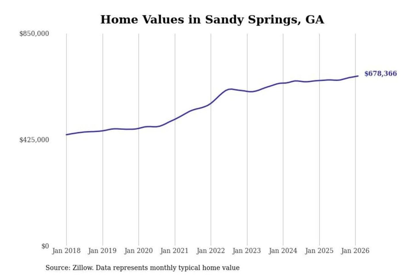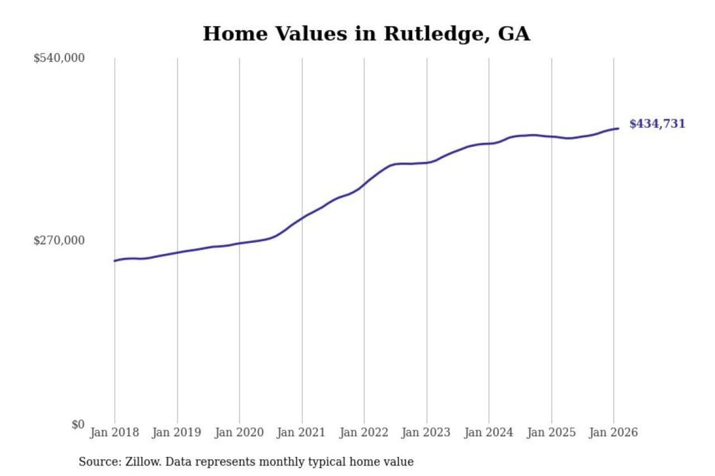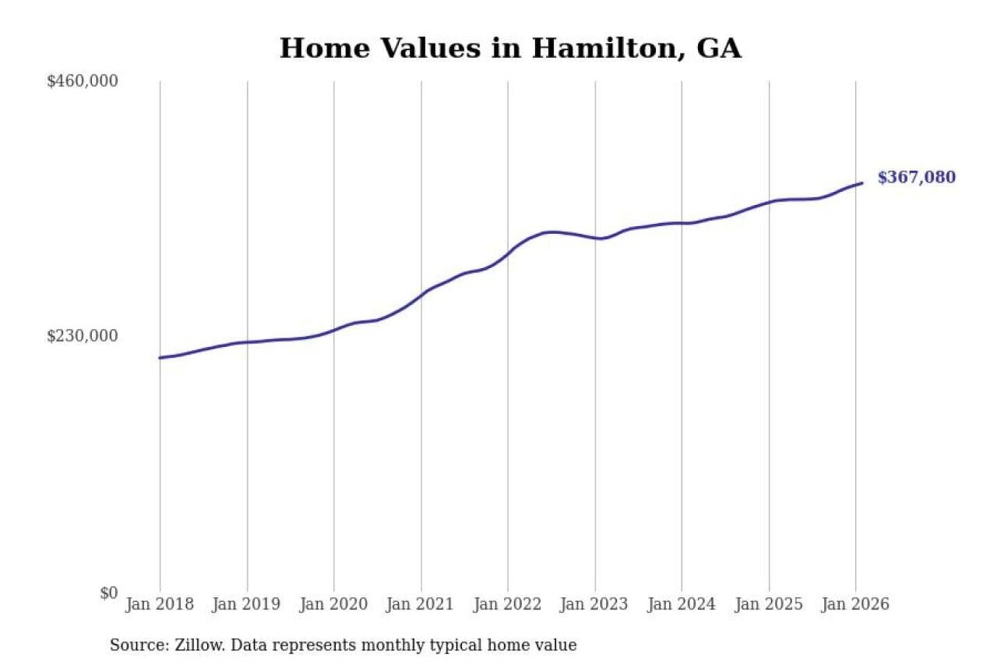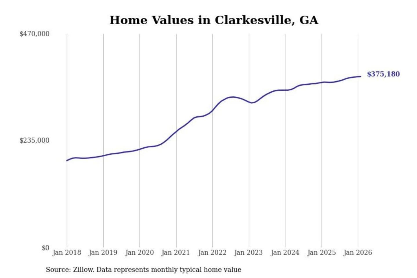 Stacker compiled a list of cities with the fastest-growing home prices in Georgia using data from Zillow. Cities are ranked by the dollar change in the Zillow Home Values Index for all homes from the 12 months ending February 2026. The charts in this story were created automatically using Matplotlib. Data was available for 50 cities and towns in Georgia.
