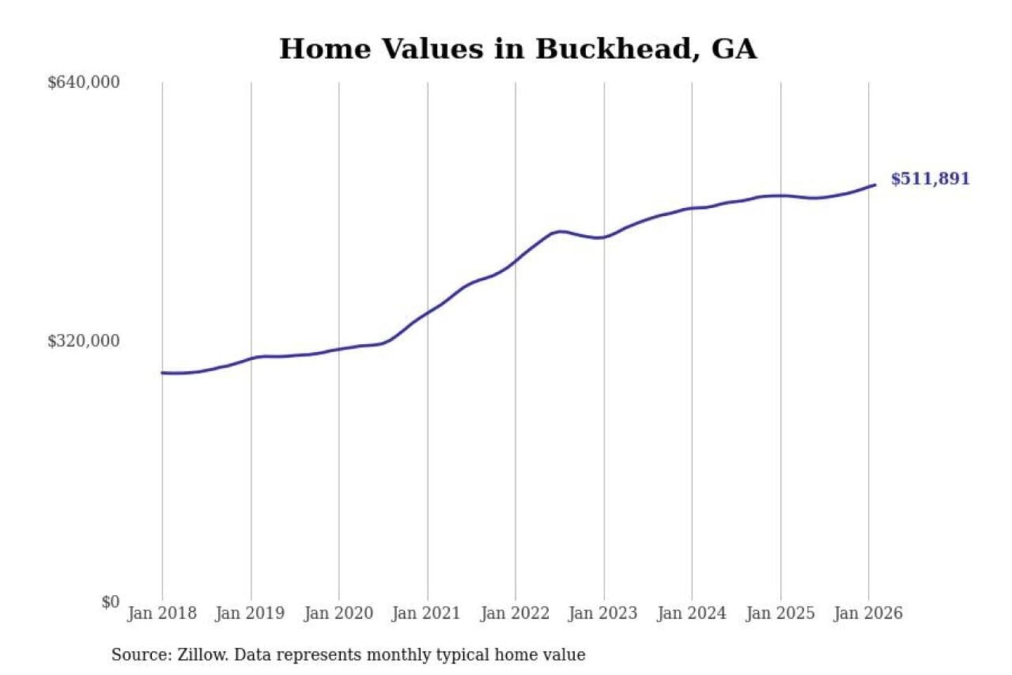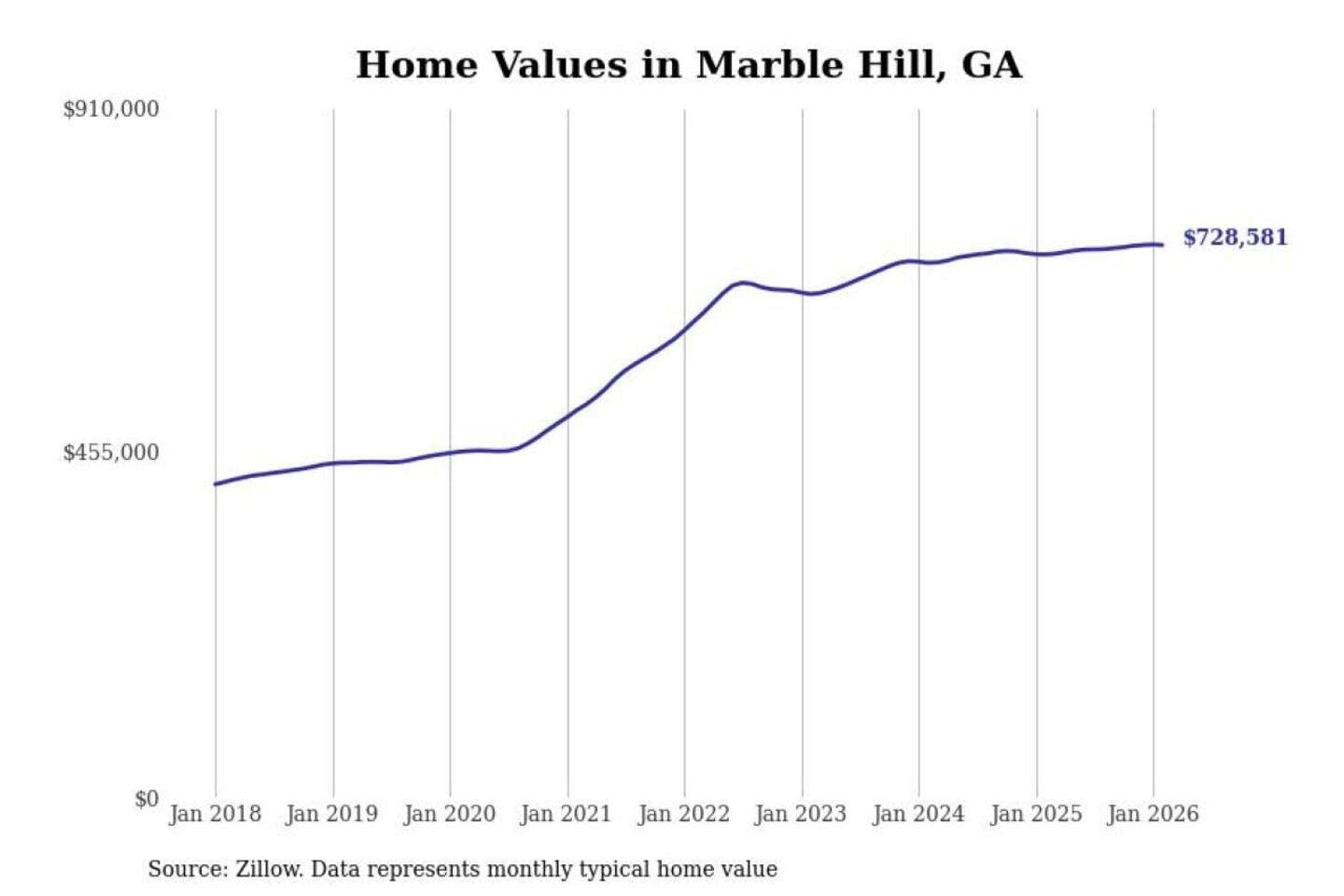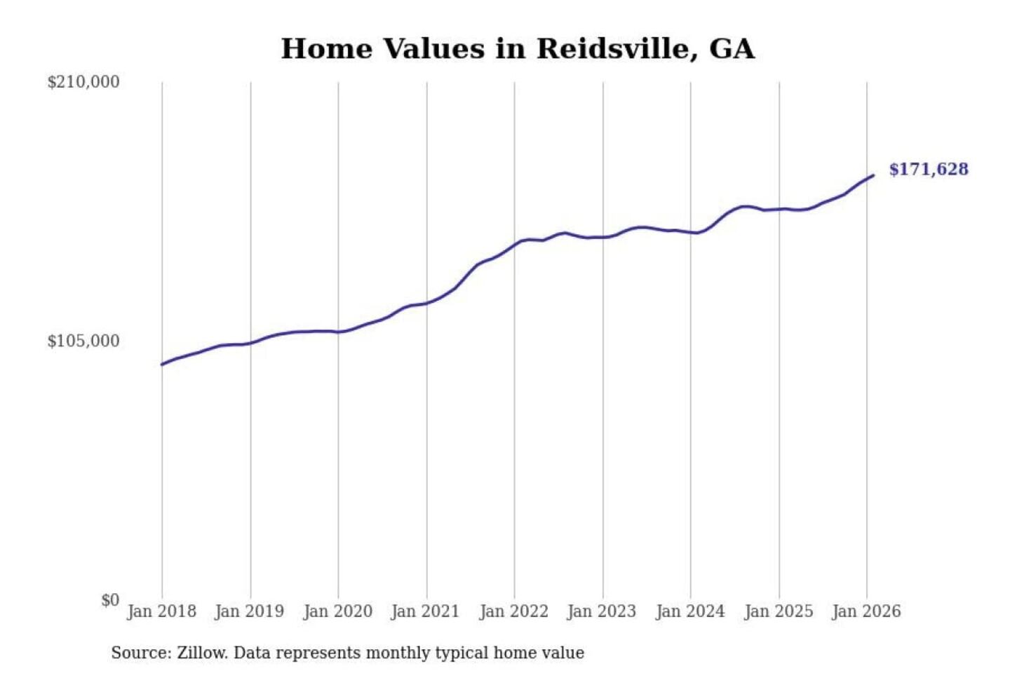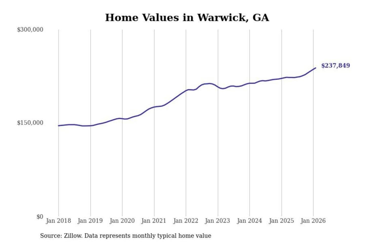Stacker compiled a list of cities with the fastest-growing home prices in Georgia using data from Zillow. Cities are ranked by the dollar change in the Zillow Home Values Index for all homes from the 12 months ending February 2026. The charts in this story were created automatically using Matplotlib. Data was available for 50 cities and towns in Georgia.